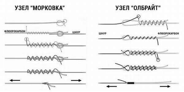 Срастить шнур и флюр можно узлами морковка, двойной паломар, двойной уни.