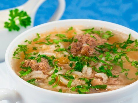 Перемешать. Сформировать из фарша фрикадельки размером с грецкий орех. Помидоры очистить от кожицы. Положить в блендер. Измельчить помидоры. Если блендера нет, можно помидоры натереть на терке. Лук мелко нарезать. В кастрюлю налить 2.5 литра воды. Вскипятить. В кипящую воду высыпать рис. Когда рис закипит, добавить фрикадельки и варить в течение 5 минут. Добавить помидоры. Добавить лук (лук можно обжарить на растительном масле). Посолить, поперчить. Варить до готовности риса. Когда суп будет готов, добавить выдавленный через чеснокодавилку чеснок. Дать настояться под крышкой в течение 20–25 минут. Суп разлить по тарелкам. Посыпать зеленью. По вкусу добавить сметану. Приятного аппетита! Ставьте