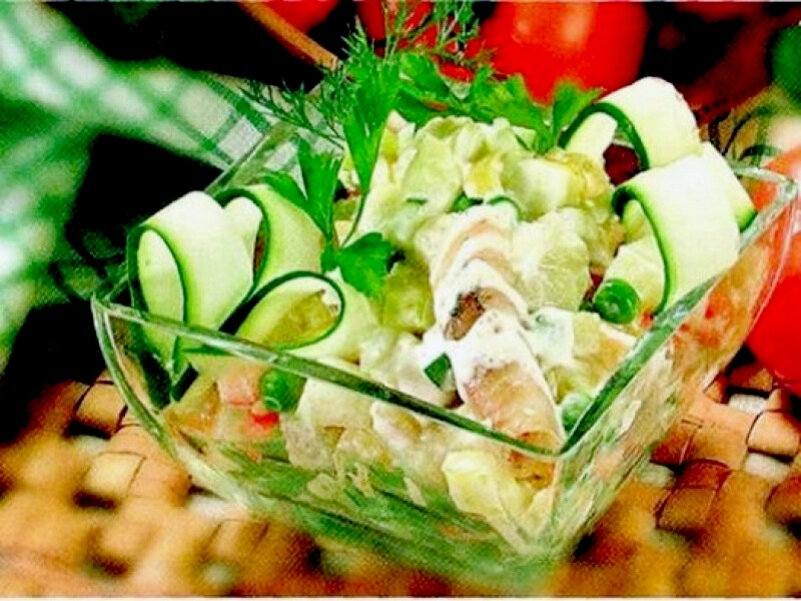 Салат всегда присутствует на праздничных столах, рецептов данного блюда огромное множество. Но узнать еще один вкусный рецепт, который предлагают в лучших ресторанах, будет интересно всем. Для приготовления этого блюда по ресторанному рецепту требуются продукты: Рецептура дана на одну порцию. Предварительно картофель отваривают «в мундире», охлаждают, очищают, шампиньоны отваривают. С огурцов снимают кожицу. Рыбу отваривают, охлаждают, снимают кожу, вынимают кости. Холодную закуску готовят по следующим этапам: Оформление САЛАТА ПО-МИНСКИ дополняют зеленью, ломтиками вареной осетрины, соленой кеты, вареными шампиньонами и икрой. Приятного аппетита. Вам может быть интересно: