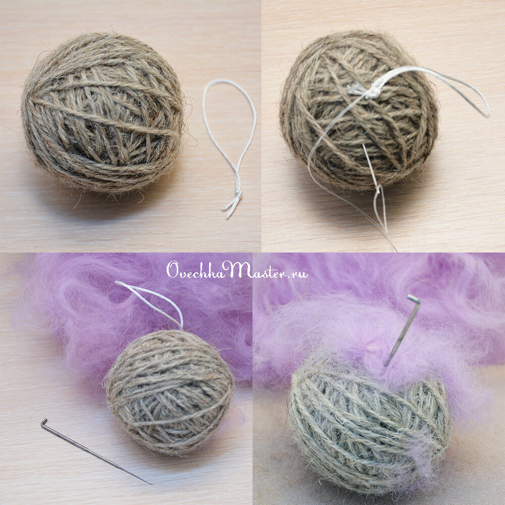 Итак, у меня основа - просто клубочек из 100% шерсти, поэтому игрушка получается по-настоящему тёплая и зимняя. К нему сразу можно пришить петельку для шарика. Я всегда брала хлопковые шнурки, а в этот раз взяла тонкий синтетический шнур для плетения. Он оказался не очень удачным конкретно для таких поделок - цепляется при работе иголочкой.