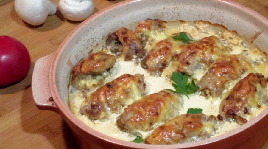 В заключение, уложенные в форму заготовки, поливаем приготовленным соусом. Готовим 30-40 минут.