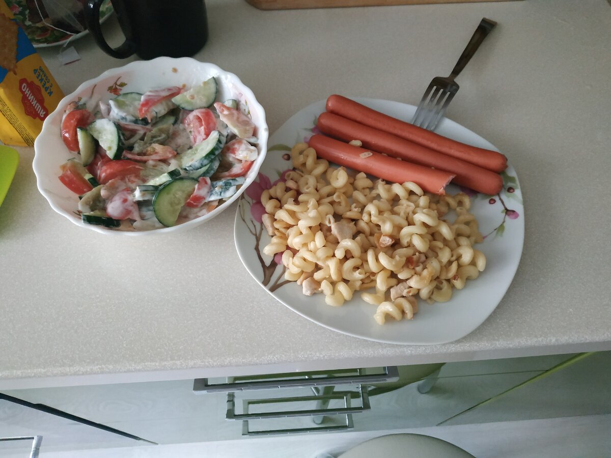 Каждое утро становиться похоже на кошмар, даже в воскресенье тело не может совладать с новым ритмом жизни и пытается меня разбудить. На этот раз у моего организма получилось это в 5.00 утра, я вообще перестал понимать почему не могу спать по человечески. Далее по валялся около часов двух решил вставать и заварить себе каши,пол пакетика, про которую я буду делать обзор завтра. Потом были запары по работе, скоро буду писать про расширение, из-за чего пришлось разгребать завалы. Приехав домой решил пообедать макаронами с сосисками. И сделал салат из огурцов с помидорами и специально купил сметаны, ведь калорийность ее намного ниже чем у майонеза. На ужин съел творог и выпил чай с малиной. Сделано на сегодня ведь выходной, но прошёл более 8000 шагов,извините, что не сфоткал. До завтра. Будет интересно
