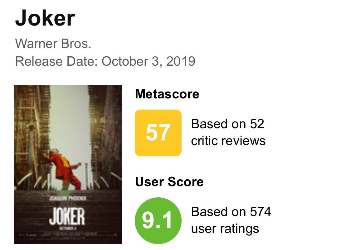 «Джокер» являлся одним из самых обсуждаемых фильмов этого года. Как и ожидалось, фильм отлично себя проявляет в кассах, но что удивительно, что мнения обычных зрителей и критиков вновь разделились. Фильм интересен в первую очередь дискуссиями и спорами вокруг него. За последнюю неделю было много всего – от предупреждений о возможном насилии до не показа фильма. Конечно, разногласия могут подогреть интерес, и это, похоже, именно так. Предварительные продажи билетов на Atom превзошли вторую часть «Оно». Что касается фильмов по комиксам, «Джокер» опередил «Венома» по предпоражам билетов, который ранее имел октябрьский рекорд в первый уик-энд. А теперь, когда фильм вышел, люди начинают обсуждать качество фильма. Как и большинство фильмов, у «Джокера» есть оценки на Rotten Tomatoes, как для критиков, так и для широкой аудитории. В настоящее время критика фильма составляет 69%, и этот процент технически считается свежим. Тем не менее, оценка аудитории составляет 92%. Это говорит о том, ч