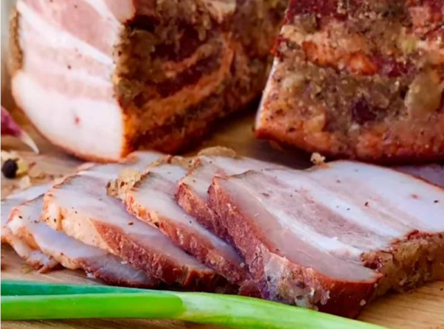 Весь секрет этого вкусного сала в луке и черносливе - вкус получается как у копченого, но при этом коптить не придется! Очень классный рецепт, вычитала его в старом журнале и хочу поделиться с вами :) Надеюсь, вам понравится Ингредиенты: сало чеснок лук (точнее шелуха от лука) чернослив соль специи (перец, лавровый лист) вода Итак, нам понадобится кусок сала с мясными прослойками весом примерно 1 кг. Разрезаем его на 2 части - так удобнее готовить. Приготовим рассол. Наливаем в кастрюлю 1 литр воды, добавляем чернослив 5 штук, 2 горсти луковой шелухи, лавровый лист, 3-5 горошин черного перца. Также добавляем 200гр соли. Соли не много, не переживайте! Главное, не передержать потом сало в рассоле, иначе получится пересоленое. Кладем в рассол сало. Доводим рассол до кипения и варим 20-25 минут. Затем оставляем сало в рассоле остывать на всю ночь. То есть держим в рассоле примерно 6-8 часов, не более. Приготовим посыпку для сала. Смешиваем 2 головки чеснока (мелко порубить ножом), черный