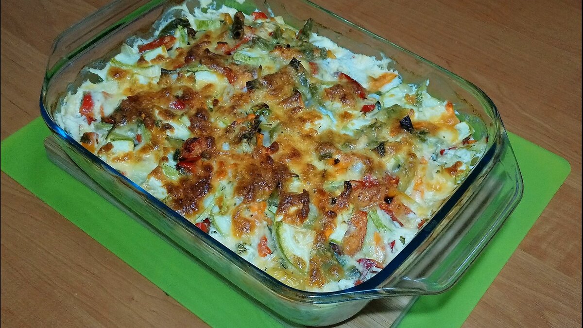 Сегодня предлагаю очередной рецепт запеканки, так как считаю такого рода ужины самыми полезными. Да, и судя по тому, что все просят добавку, не зря так делаю. И вам, кстати, советую переходить от раздельного приготовления овощей и мяса к запеканкам - это и быстрее, и всегда сочно получается. А еще запеканка выглядит празднично на середине стола. Ингредиенты: Заливка: Также нужны 100 грамм сыра и пара зубчиков чеснока (3-5). 1. Несмотря на большой список продуктов, готовится запеканка быстро и просто. Начинаем с нарезки всех овощей: лук, морковь, перец, помидоры, кабачки (их не очищаем от кожуры). 2. Выкладываем в большую миску нарезанные овощи, добавляем мелко порубленный укроп, свежемороженный зеленый горошек и стручковую фасоль (она у меня была предварительно отварена и заморожена). Солим овощи и перемешиваем. 3. Режем куриное филе пластами и отбиваем через пищевую пленку. Затем солим с обеих сторон. После выкладываем на дно формы для запекания и выдавливаем на мясо чеснок. Свер