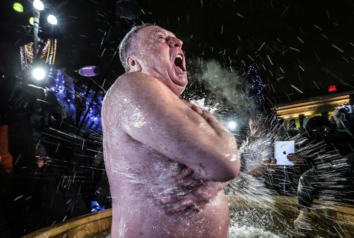 Знаменитости на Крещение в проруби. Владимир Жириновский, лидер фракции ЛДПР: «Я считаю, что должно быть потеплее — зачем морозить организм?» Зато Никиту Джигурду холодной водой не напугать — свой организм актер закаляет ежедневными обливаниями. В перерывах между сценами Максим Аверин с завистью поглядывал на моржей, которые ныряли в ледяную воду неподалеку от съемочной площадки. - А окунусь-ка и я, пожалуй! - вдруг выдал Максим. От этого заявления по телу многих членов съемочной группы пробежала дрожь. - Макс, ты чего?! На градуснике - ниже нуля! - раздался голос коллеги. - Не чуди! Но артист встал и направился прямиком в свой грим-вагон. Через пять минут Аверин появился в белом халате, тапках на босу ногу и захрустел по снегу в направлении водоема. У проруби Максим скинул халат, перекрестился и нырнул в ледяную купель. До самого последнего момента, пока Галустян не нырнул в ледяную купель, он продолжал шутить и улыбаться, хотя невооружённым взглядом было видно, что ему немног