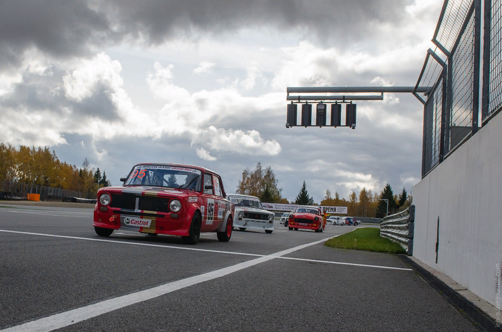 Любит наш народ всякое говно гоняться на автомобилях родом из СССР. Вот эти все Жигули-Волги-Москвичи после мелкого тюнинга могут нарезать круги по автодрому для F1. И пилоты рады и зрителю интересно. Суббота порадовала хорошей погодой. Решил я воспользоваться последними солнечными деньками в этом году. Наделал красивых светописей раритеных автомобильчиков на фоне осеннего Подмосковья. Организаторы Moscow Classic Grand Prix решили замахнуться на Вильяма понимаете нашего Шекспира длинную гонку. 300 километров это не шутки даже для современной техники. А на трассу под Волоколамском в субботу выехали машинки с годом рождения 1987 и старше. Гонка стартовала под бой курантов. Ага ровно в 12.00. Старт тоже дань автомобильной истории - как стартовал легендарный Ле Ман до 1971 года, от стены питвола. Стартовали то все, но в течение первой получасовки команда эвакуации работали не покладая рук. Где то техника не выдерживала, а где то пилоты излишне оптимистично расценивали своё мастерств