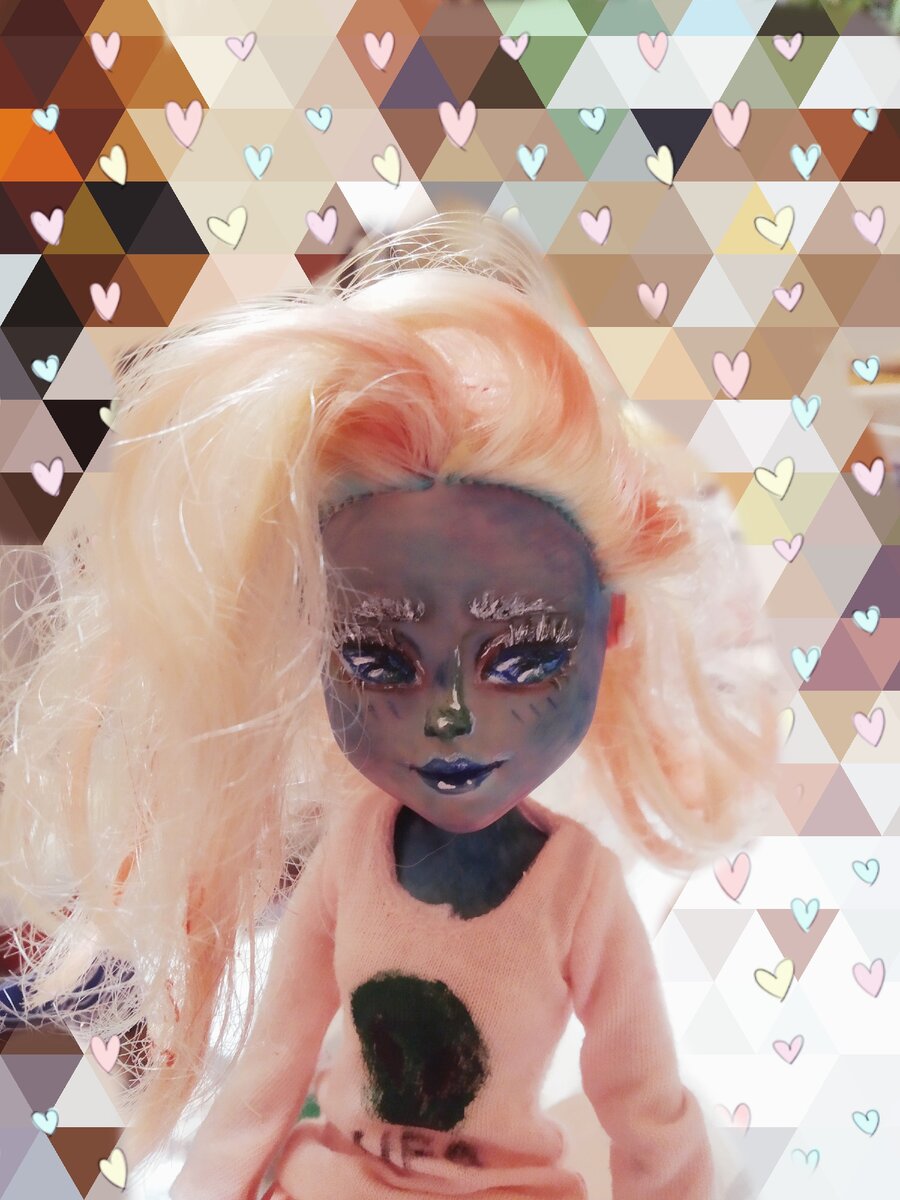 Здравствуйте,дорогие любители куколок. Моя история начинается с того,что я очень любила в детстве играть в куклы, но с возрастом они были забыты и заброшены в дальний ящик. Как же меня угораздило на ооак? Видео на Ютубе. Смотря один блог захотелось достать своих куколок и вернуть их к жизни. Первой под горячую руку попалась блондинка из коллекции "Moxie". Помню время,когда с полок магазинов пропали мои любимые "Bratz" и появились похожие на них, однако миловидные и притягивающие Moxie. В момент когда я достала эту куколку в потрёпанном состоянии - захотела сделать что-то с её волосами, у меня оставалась розовая краска и я по неопытности окрасила волосы куклы в розовый. Спустя сутки пошла смывать и оказалось, что кроме лица ничего не окрасилось... Усердно оттирая краску-снялся макияж, но ярко-розовый оттенок с лица так и не ушел. Пришлось придумывать,как его убрать. Я использовала бирюзовые и синие оттенки из пастельной палитры"faber Castell". Затем начала делать набросок с помощью акв