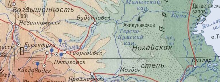 Ногайцы когда-то проживали не только в одноименной степи, но и западнее. До сих пор сохранилось их село Канглы. В 1866 году право ногайцев на свою малую родину было признано официально. До этого они подвергались гонениям со стороны местного казачества (хотя казаков было в 3 раза меньше). Река Кума находится здесь в более широких берегах, разливаясь весной до 400 метров. Достопримечательностью следует считать Соборную мечеть. Курорт Кумагорск (лесополоса на одиночном плато Кокуртлы с совмещенными санаторием и краевой больницей) находится в 1200 метрах к северу (за мостом через Куму). Недалеко (если идти в обратную сторону) устроена одноименная ЖД-платформа. Место известно парочкой гор-лакколитов (Кинжал и Кум-гора). Под ними выход минеральных источников, на использовании которых и основывается лечение в учреждениях. С вершины Кинжал видны Пятигорье, КЧР, озеро Кумагорское, степи Новоселицкого и Кочубеевского района 26-го региона. На восточных склонах добывали природный камень. Еще одна «изюминка» – само здание бальнеологической лечебницы. Оно (вместе с окружающей ухоженной территорией) больше напоминает Версаль. Здешняя вода возвращает тканям эластичность. И после сложных операций здесь реабилитируются люди со всего СНГ. Лечебница была основана в 1773 году. Тогда впервые стали разбивать цветники а ландшафтные парки на зеленом плато Кокуртлы.