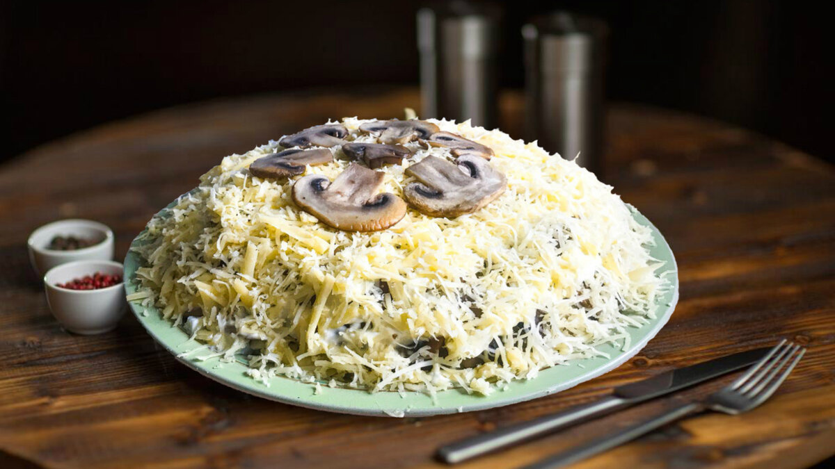 5. Твердый сыр натереть на мелкой терке и выложить последним слоем.