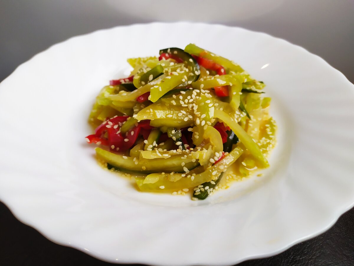 7. Наши овощи поливаем соусом и посыпаем кунжутом. Хорошо перемешиваем и ставим настояться в холодильник примерно на 1 час. Наша закуска готова!