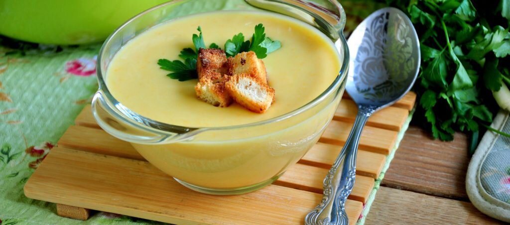 Супы пюре хороши тем, что надолго утоляют голод при минимуме калорий! Такой супчик порадует маленьких деток, мамы которых начинают прикорм, а также пойдет на пользу и самой молодой маме, которая возвращается в форму и следит за фигурой. Ингредиенты : -Капуста белокочанная 250 гр, -Картошка 150 гр, -Лук репчатый 50 гр, -Морковь 50 гр, -Чеснок 1 зубч, -Лавровый лист 1 шт, -Растительное масло 1 ст.лож. -Поваренная соль по вкусу, -Перец чёрный по вкусу, -Вода 700 мл. Приготовление: Нарезаем лук, морковь и чеснок, овощи можно особо не мельчить потому как все будем превращать в пюре .Обжариваем морковь и лук на масле ,добавляем чеснок, перемешиваем и снимаем с огня .Пока овощи обжариваются, крупно нарезаем картошку ,капусту. Выкладываем обжаренные овощи в кипящую в