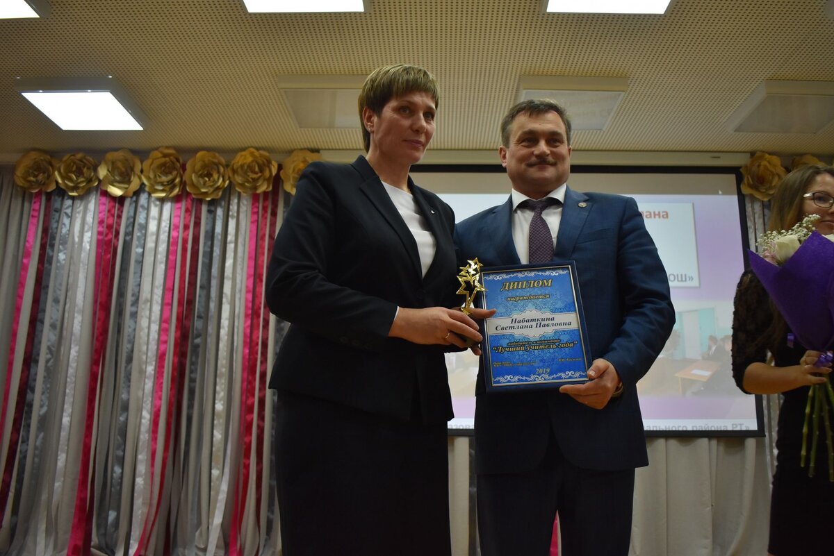 Накануне Международного Дня учителя, в Верхнем Услоне наградили лучших работников образования района. По итогам 2018-2019 учебного года и в рамках празднования Дня учителя, состоялась III ежегодная церемония вручения премии "За верность профессии", где принял участие и поздравил виновников торжества глава района Марат Зиатдинов. Лучшим иучителем года стала учитель истории и обществознания Большемеминской школы Светлана Набаткина. Лучшими в своих номинациях названы воспитатель Макуловского детсада Миляуша Салахутдинова, заместитель директора Кураловской школы по учебной работе Наталья Корнева, заместитель директора по воспитательной работе Сергей Анохин и психолог Ольга Корнильцева из Верхнеуслонской школы, классный руководитель 10 класса "Лицей Иннополис" Ольга Елисеева, педагог Центра дополнительного образования Айнур Халиуллин. Подробнее: http://vuslon.ru/news/obschestvo/ikh-nagradili-za-vernost-professii-fotoreportazh