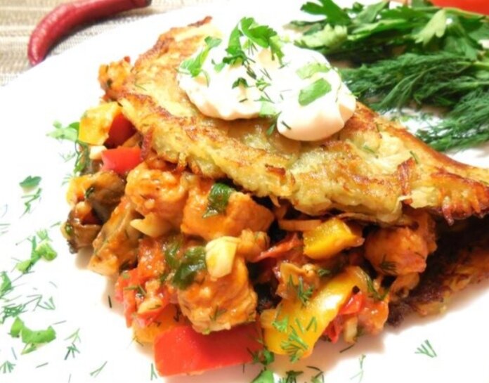 ИНГРИДИЕНТЫ : ДЛЯ ГУЛЯША : ДЛЯ ДРАНИКОВ : С / П : 1. Подготавливаем все необходимые продукты. 2. Берём мясо нарезаем средними кубиками. 3. Болгарский перец очищаем от семян, нарезаем так же не крупными кубиками. 4. Помидоры так же кубиками нарезаем. 5. Грибы вымать, средне нарезать. 6. Мелко режим лук. 7. Зелень мелко рубим. 8. Чеснок так же мелко накрошить, можно пропустить через пресс. 9. Складываем мясо в миску, обваливаем в муке. 10. Разогреваем сковороду с маслом, выкладываем мясо. Обжариваем минут 5,постоянно помешиваем. Перекладываем в тарелку. 11. Выкладываем на сковороду лук, перец, грибы, обжариваем минут 8,при необходимости добовляем масло. 12. Затем добавляем помидоры и обжариваем ещё минут 5. 13. Посыпаем все паприкой, перчим, добавляем томатную пасту. Все перемешиваем. 14. Выкладываем мясо, перемешиваем, тушим гуляш на медленном огне 20 минут. После при необходимости добавляем немного воды и тушим ещё минут 20. 15. Лук и картофель, чистим, моем. 16. На м