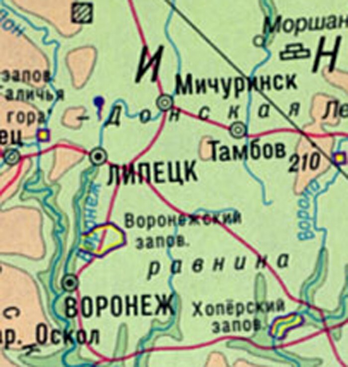А по левую руку мы наблюдаем единственную на маршруте особо охраняемую природную территорию – ГЗ «Воронежский». Он охраняет и воспроизводит крупнейшую в Европе популяцию речного бобра (есть даже бобровый «зоосад»). В плане флоры, «символом» резервата считается типичная южная тайга. Имеются в виду смешанные заросли сосны, если, березы и черной ольхи (а у самой воды она в виде кустарника). Площадь тенистого запретника, пересеченного реками Усманка и Ивница – 31 053 гектара. Еще одна выгодная особенность – ряд редких пирамидальных дубов, вольеры с животными, Музей Природы и экспозиция Пескова. Все они обнаруживаются в центральной усадьбе по имени «Бор» (в нее нетрудно попасть, пройдя от станции 5 км).