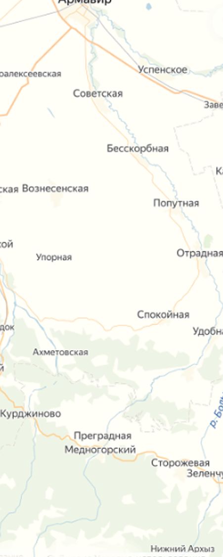 Здесь сплав по реке Уруп интересен экскурсией по городку среднего размера (вместе с довольно развитым пригородом он составляет 10 километров). Это – самый большой жилой массив в русле (в Армавире река пересекает лишь 2 небольших района). Возвышенностей в этих краях уже не остается. Только слабохолмистая местность. Окружение станичных микрорайонов – одни только поля, теплицы, массивы речной поймы (откуда отходят каналы) и неплохое шоссе на Армавир. Инфраструктура стандартная. Места для купания все еще неудобные (лучше потерпите до Армавира). Брендом огромного села называют живописное озеро, 5 небольших прудов и яркий праздник Кубанской Кухни. Ранее (с 1841 года и до окончательной победы большевиков) муниципия носила имя «Урупская». На территории работают 4 крупных аграрных и перерабатывающих хозяйства. Самый широкий участок поймы на восточной стороне.