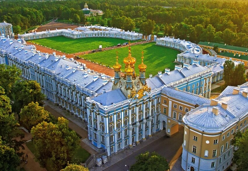 Экскурсии по пригородам Санкт-Петербурга нельзя закончить, не посетив места, где обучался и вдохновлялся главный русский поэт. Сюда впервые провели и железную дорогу. В Царском селе мы полюбуемся на Екатерининский и на Александровский дворцы. По названиям видно: первый немного старше. Он двухэтажный. Строился в 1717 году как летнее поместье Екатерины I. В духе голландского барокко. Перестраивался при Елизавете архитектором Растрелли. После получил вид «русского барокко». От европейского аналога его отличает простота и четкая структурность композиции. Но не это главное. В императорской «усадьбе» располагалась знаменитая янтарная комната.