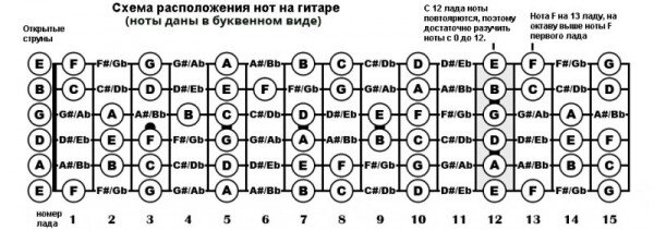 Запутанно, не правда ли? Это только с первого взгляда – посвятите первую неделю тому, чтобы безошибочно ориентироваться в нотах открытых струн, нотах на 5 и 10 ладу. Обратите внимание, что на 12 ладу ноты идентичны открытым струнам – только они на октаву выше. Соответственно каждые 12 ладов на струне – это октава и ориентироваться нам нужно только в промежутке с 0 по 11 лады – далее все расположение нот повторяется!