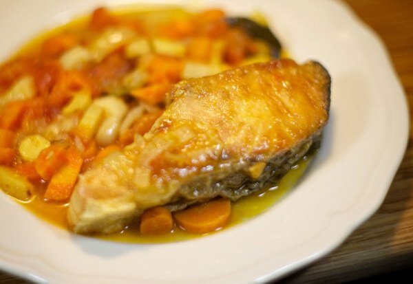 Стейк лосося в духовке с овощами – это рецепт, доставшийся мне от мамы. Раньше лосось был редким блюдом, даже для моей мамы, жившей в приморском городке. Иногда удавалось купить лосося «из-под полы» у браконьеров (современные хозяйки, наверное, не знают, что это такое – из-под полы). Поэтому мама использовала для приготовления этого блюда любую рыбу, чаще – пеленгаса. Но, конечно же, лосось тушеный с овощами получается лучше всего. Мама добавляла к лососю корень петрушки из своего огорода, но мне не удалось его купить, поэтому использую корень пастернака. Получилось ничем не хуже. Готовя лосось с овощами, рыбулучше брать с костями (так кусочки не развалятся при тушении). Кстати, этот рецепт очень хорош и для костистых рыб: если вы станете тушить с рыбу овощами, то часть наиболее мелких костей будет разварена во время приготовления пищи. Ингредиенты: 4 стейка лосося (около 900 г);