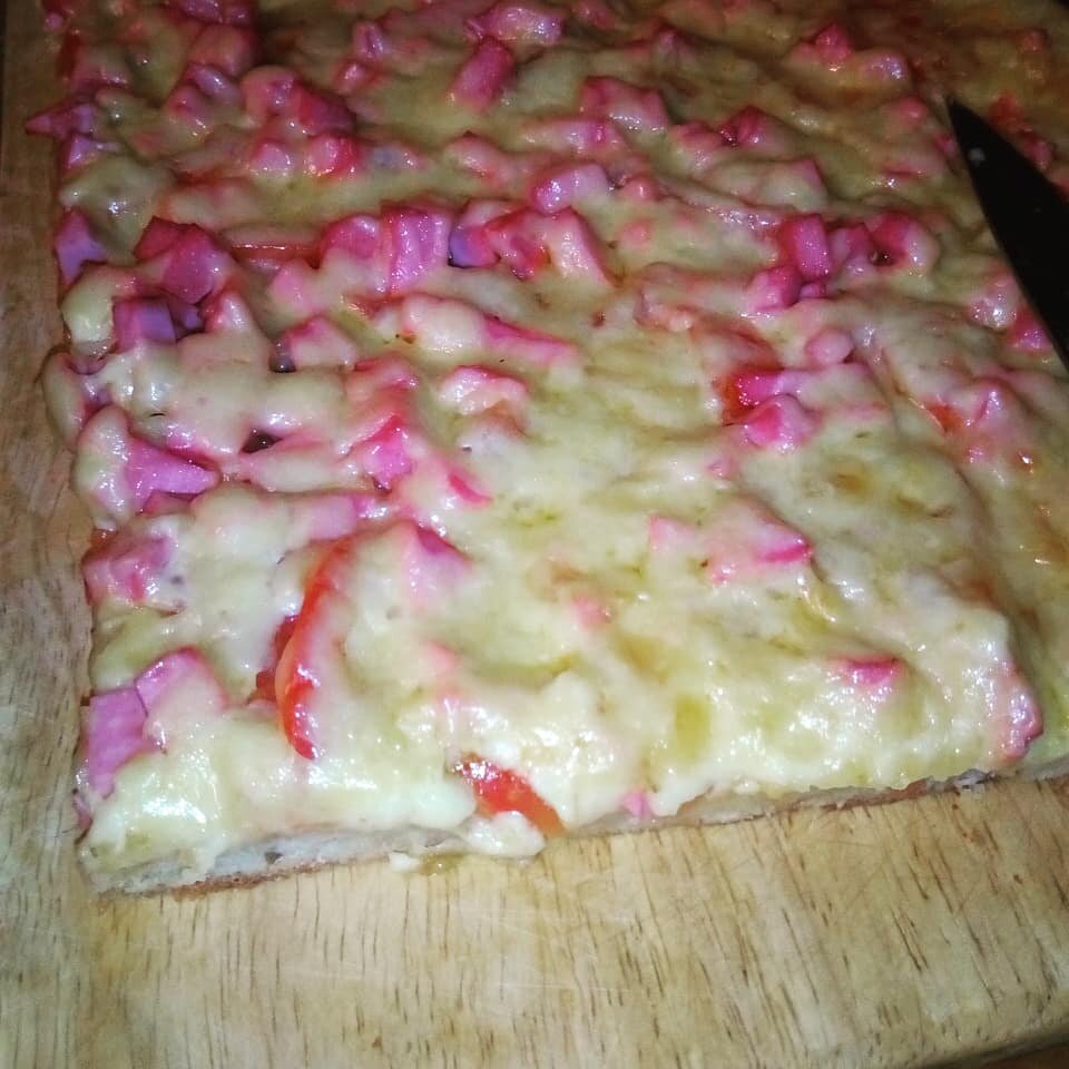 Не стать мне фудблогером. Не получаются "вкусные" фото. Сегодня сын раскрутил на пиццу. А так как просил её он, то минимум продуктов, вредящих малолетним. Рецепт подсказан тетушкой много лет назад и не было ни разу, чтоб пицца не получилась.