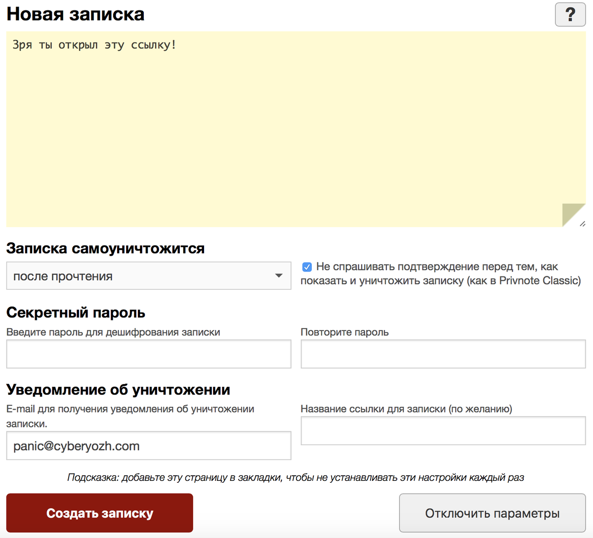 Всем привет, с Вами снова Black Cloud https://t.me/DarkCloudUse Суть предлагаемого способа в создании ссылки-ловушки, которая будет добавлена к сообщению. Ловушка будет создана при помощи одноразовой записки Privnote. О сервисе одноразовых заметок Privnote мы уже писали ранее. Это очень полезный сервис, и если ранее мы использовали его для разрыва целостности информации в сообщениях, то теперь он послужит нам в создании ловушки для любителя читать чужие переписки. Соль записки Privnote в том, что после прочтения она удаляется, и более ее прочесть невозможно – этот функционал сервиса известен многим, однако не все знают, что у Privnote есть возможность получить уведомление о прочтении записки на электронную почту. Первым делом вам надо создать записку Privnote. Обязательно при создании записки выберите опцию «Не спрашивать подтверждение перед тем, как показать и уничтожить записку (как в Privnote Classic)», нам не нужны никакие подтверждения. Обязательно укажите «E-mail для получени