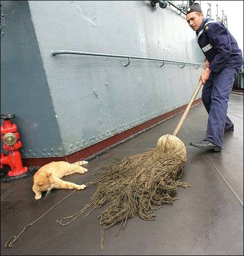 Пользуются щётками и на наших кораблях. Правда, в описаниях машкообразных швабр говорится, что они особенно хороши как раз для собирания влаги с промытых поверхностей. Отрицать это трудно, но вот на снимках я нашёл их только в руках наших матросов.