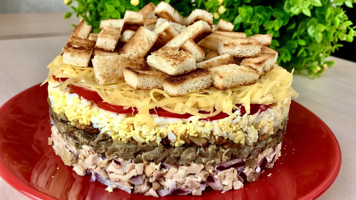 5. Отправляю салат в холодильник на 30 мин. В это время делаю сухарики. Беру 3 кусочка тостового хлеба , отрезаю корочки и режу на