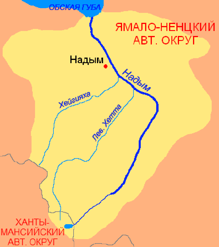 Река Надым в длину составляет 545 км. Ее бассейн – 64 000 кв. км. Максимальная ширина в устье – 3 километра (протока Собачья Речка). Глубины не превышают 4 м, а чаще они 2-3 метра. Подъем уровня воды в половодье достигает 0,7 метра. Река безопасна в верховьях, паводок длится всего 45 дней. Лишь в районе города Надым подъем воды может составить до 3,7 метров. Расход воды равен 590 кубометрам в секунду. Протекает водоем по Ханты-Мансийскому и Ямало-Ненецкому автономным округам. Направление – север. Питание снеговое. Ледостав длится 225-230 суток. Весенний ледоход затягивается на 5 дней, а вот осенний – на целую неделю. В целом водоем освобождается ото льда уже в конце мая. То есть самый полноводный месяц июнь. Притоков более 50 километров 54. Основные – Левая Хетта, Татлягаяха, Хейгиеяха, Правая Хетта и Симиеган (они длиннее 60 километров). Кроме того бассейн соединяется и со старицами. Вместе с ними объектов уже 2 800. В русле еще находятся озера. В количестве 44 800. Они соединены с болотами.