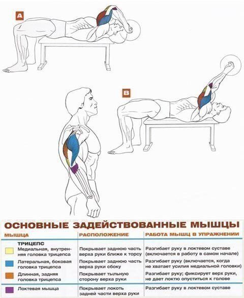 Задействованные мышцы: Если гриф штанги опускается ко лбу, то больше задействованы медиальная и латеральная головки трицепса, если гриф штанги опускается за голову, то задействована главным образом длинная головка трицепса. Варианты: Французский жим имеет несколько разновидностей. Его можно выполнять стоя и сидя, лежа на наклонной скамье головой вверх и головой вниз, на тренажерах, с гантелями, со штангой с гнутым грифом (точную технику смотрите на видео). В последнем случае выполнять упражнение намного удобнее, поскольку частично снимается нагрузка с предплечья. Французский жим: техника - Лягте на горизонтальную скамью со штангой
