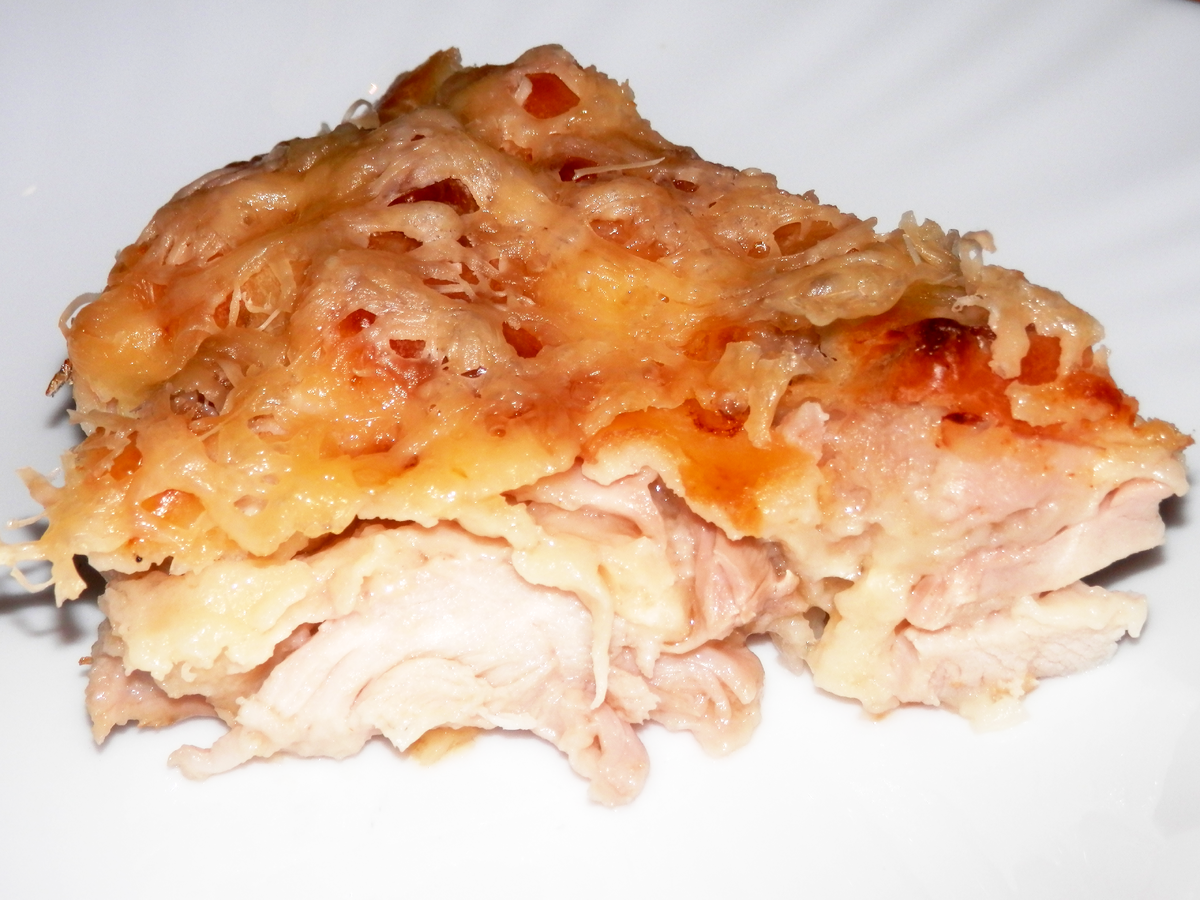 Сочную курицу, окутанную тонким слоем теста и покрытую запеченной корочкой, можно приготовить в духовке. Вам не придется стоять у плиты и переворачивать каждый кусочек! Сначала замаринуем курицу: Куриное филе(бедро 700 гр.) нарезаем кусочками примерно 3 на 3 сантиметра. Выкладываем в чашку; добавляем 1 ст. ложку майонеза, 1 ст. ложку винного уксуса, соль, перец или другие пряности по вкусу. Маринуем от 15 до 30 минут. Когда курица замаринуется, кладем в нее 1 яйцо и вливаем 1/3 стакана молока. Добавляем 3 ст. ложки растительного масла и щепотку соли. Все перемешиваем. Кладем 4 ст. ложки муки (по одной ложке и каждый раз размешиваем до однородного теста). У нас должен получиться кляр консистенции густой сметаны. Добавляем 70 гр. тертого сыра и еще раз перемешиваем. Форму застилаем пекарской бумагой ( уголки не обрезаем - так потом будет легче достать пирог из формы); смазываем растительным маслом и выкладываем тесто с курицей. Слой не должен быть слишком тол