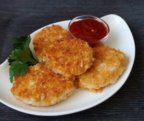 2. Из полученной массы сформировать небольшие котлетки. Обвалять котлетки в панировочных сухарях.