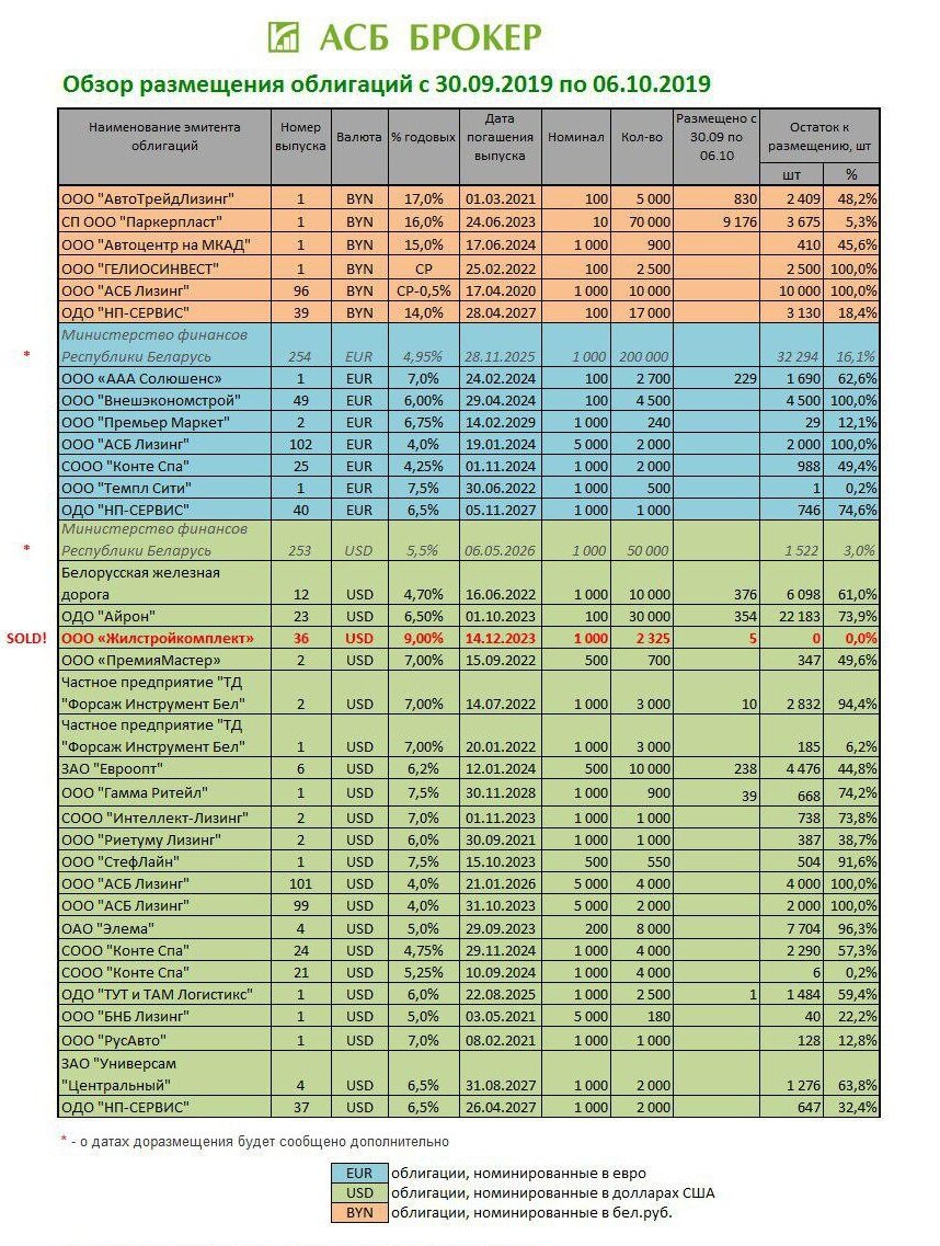 Статистика размещения облигаций на первичном рынке. Сороковая неделя 2019г. 30.09.- 06.10.2019.