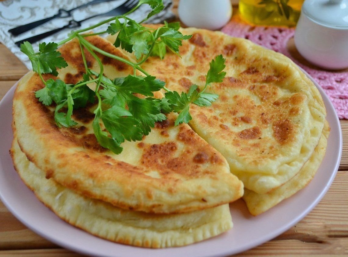6. Разделите тесто на 4 части. Каждую часть раскатайте тонко, примерно 5 мм. И тут есть два варианта лепки: можно сделать обычные пирожки или чебуреки. Положите на край теста начинку, аккуратно распределите.