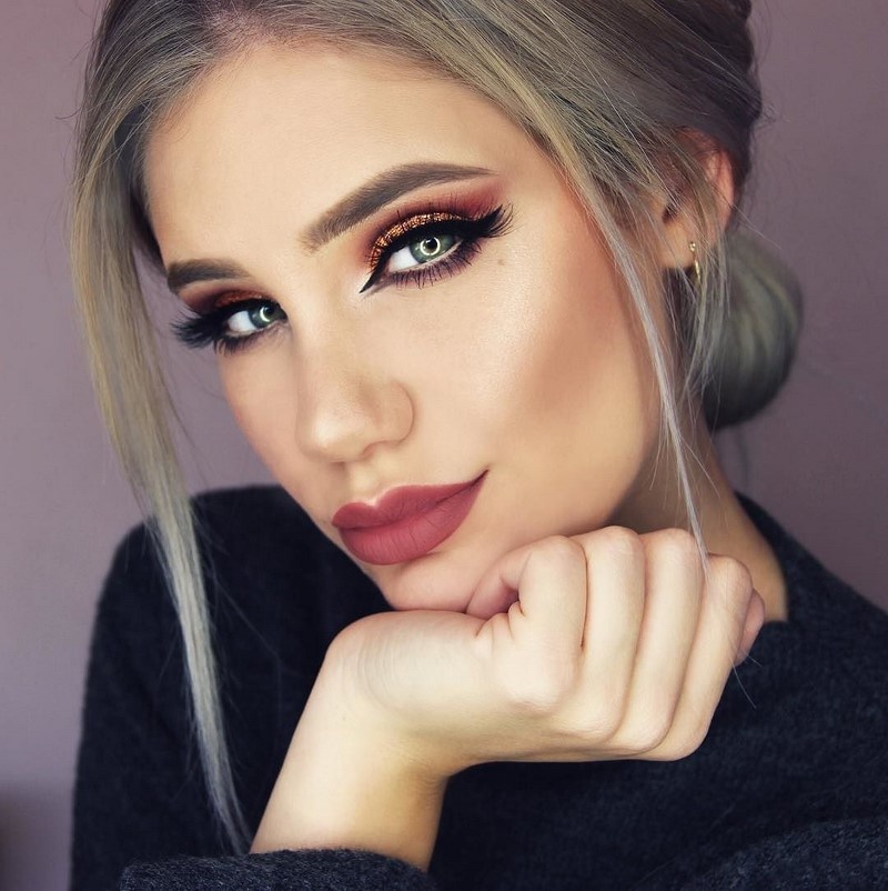 Любителям ярких макияжей можно наносить рисунки или стразы, краситься яркими цветами, популярный цвет для губ красный.