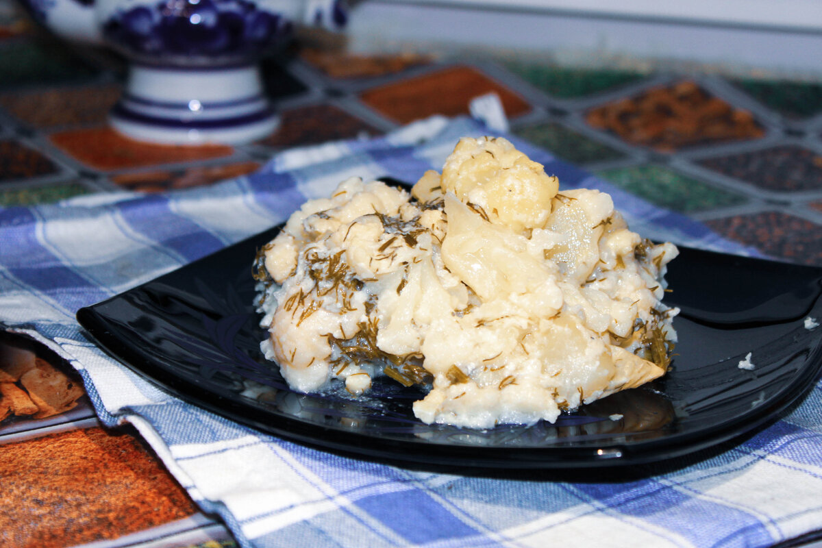 Этот рецепт открыл для меня цветную капусту по-новому. Ингредиенты: Цветная капуста - 500 г Чеснок - 3 зубчика Укроп - 1 пучок Кефир - 150 мл Мука - 2 ст.л. Масло растительное - 1 ст.л. Соль, перец - по-вкусу Приготовление: 1. Капусту отварить в течение 2-3 минут. Она должна остаться немного сыроватой. Процедить и оставить 1 стакан отвара. 2. Укроп мелко порезать, чеснок измельчить. 3. Обжарить муку с маслом на сковороде до характерного легкого орехового запаха и нежной золотистости. Постоянно мешать, так как мука очень легко пригорает. Заварить муку горячим отваром. 4. Добавить в сковороду кефир, укроп и чеснок. Добавить соль и перец. Тщательно перемешивая довести до кипения и выключить. Получается ароматный соус. 5. Выложить капусту в соус и тщательно перемешать, чтобы капуста была полностью покрыта соусом. Переложить в форму для запекания и запекать 20 минут в предварительно разогретой до 180 градусов духовке.