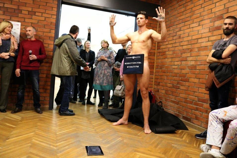 В Беларуси есть много художников один из них это Алексей Кузьмич, на очередной выставке он хотел показать пару своих работ, но так как выставку курировал Минкульт некоторые работы не прошли цензуру, их попросили их перевернуть, чтобы сделать не читабельными. Как говорится любой художника обидеть может, но наш Леша не растерялся, не далеко от выставки он купил в аптеке "виагру", проглотил ее и направился к месту мероприятия. На входе обиженный художник надел на свой хер табличку с надписью "Министерства культуры Республики Беларусь". Это он сделал как протест цензуре искусству, которое должно быть свободное во всех своих проявлениях и доступно каждому. Многие перфоманс поняли и приняли, но вот Директор центра современного искусства Сергей Криштапович, отреагировал на перфоманс голого художник: "Не имеет таланта"