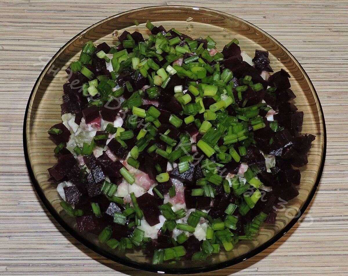 Недавно купил на блошином рынке «Книгу о вкусной и здоровой пище». Издание еще пятидесятых годов, культовая в своё время была книга среди советских поваров. Решил опробовать некоторые рецепты из неё, вот что получилось. Салат из сельди очень прост в приготовлении, а продукты, входящие в его состав – доступны. Один из основных ингредиентов – селедка. Её можно купить уже солёную, но мы предпочитаем солить рыбу сами, по своему рецепту. Здесь тоже всё просто, рыбу надо выложить в ёмкость и засыпать солью со специями, оставить так при комнатной температуре на сутки. Еще понадобится четыре варёных куриных яйца, пару яблок, несколько картошин, парочка солёных огурцов и варёная свёкла. Овощи и яблоки нарезаем небольшими ломтиками, яичный белок тоже. В рецепте есть еще соус, но я не стал с ним возиться, да и на вкус он наверное так себе, поэтому салат заправлен соусом тар-тар, купленным за 56 рублей. Когда все ингредиенты подготовлены, смешал картофель, яблоки, огурцы и часть рыбы с соусо