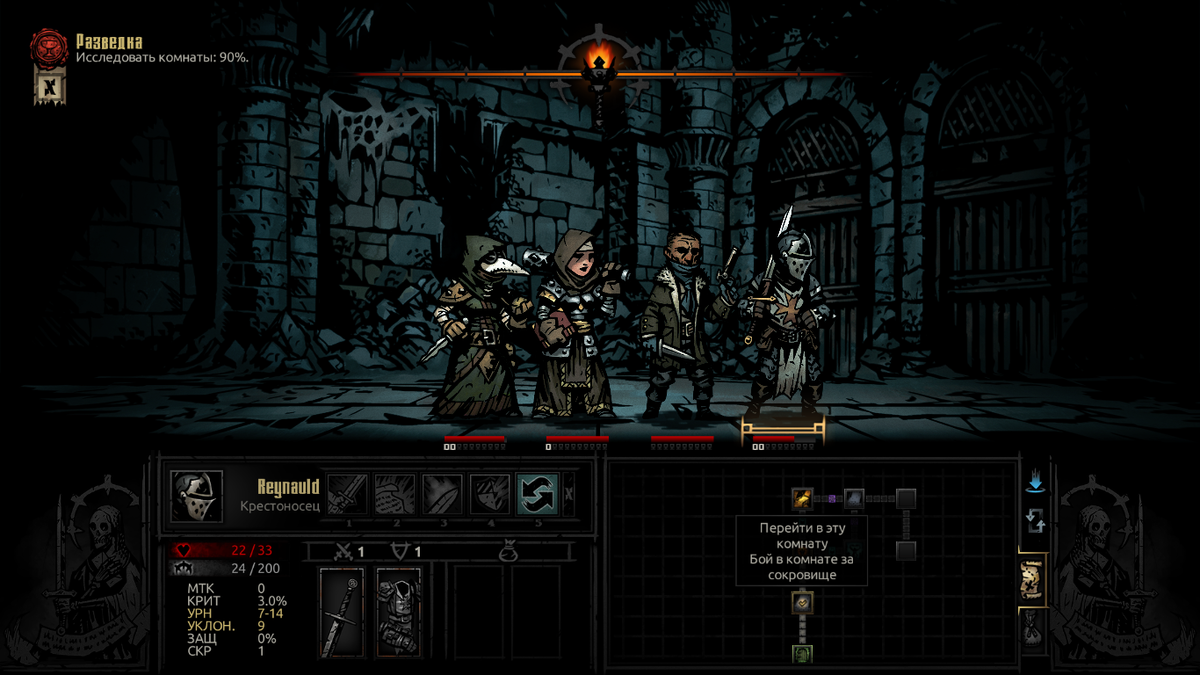 Продолжаем наш бравый поход. Разведка показала, что впереди есть помещение с сокровищами. Наконец-то отобьем деньги, что затратили! Хотя...кто знает как все обернется еще. Кстати, чумной доктор - это женщина! А ведь по лицу не скажешь...Хе-хе, шутка конечно. В этих чумовых балахонах может скрываться кто угодно, но юбка...да и некоторые высказывания этого персонажа наводят на эту мысль. Но вернемся к нашим героям. По пути к этой комнате нашли валяющийся рюкзак. И что вы думаете? Рыцарь наглым образом прихватизировал содержимое себе! Он обалдел что-ли? Да он! Да я! Фуф... я остыл... Можно сказать, что это равноценный обмен за то, что я его споил той красной жидкостью. Пригляделся в его харю...э-э-э то есть характеристику, выяснилось что он клептоман оказывается. Ну, блин! Он же меня оставит без сокровищ так, и плакал мой план по оздоровлению экономики города... С такими думами мы дошли до места, а там были сектанты и скелет. Они явно не ожидали, что мы явимся как гром среди ясного неба.