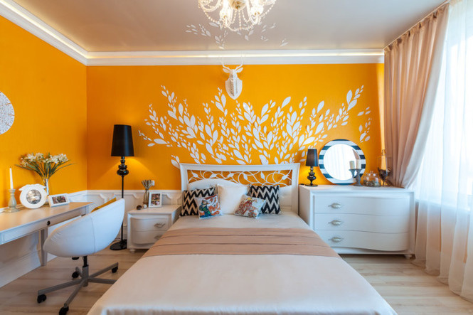 Особенности желтого цвета в интерьере Желтый цвет стен – одно из лучших решений для небольших помещений, для комнат с окнами на север, в которых не хватает тепла и солнечного света. Желтый наполняет пространство позитивной энергией, создает уютную домашнюю атмосферу, располагает к приятному общению и хорошему настроению. Но при всей оптимистичности цвета, он может дать излишнюю яркость и довольно требователен к цветам-компаньонам. Неправильно выбрав оттенок желтого или купив неподходящие шторы к желтым обоям, можно получить чрезмерно яркий, утомляющий интерьер. По мнению дизайнеров, для отделки стен подходят слегка приглушенные и светлые пастельные оттенки желтого, а вот с лимонным, неоновым желтым и золотисто-желтым нужно быть аккуратнее. Выбор штор к желтым стенам Какие шторы подойдут к желтым обоям? Идеальные сочетания цвет солнца дает практически со всеми природными оттенками: ·Синий. Комбинация желтого с любым оттенком синего ассоциируется с синевой летнего неба, освещенного сол