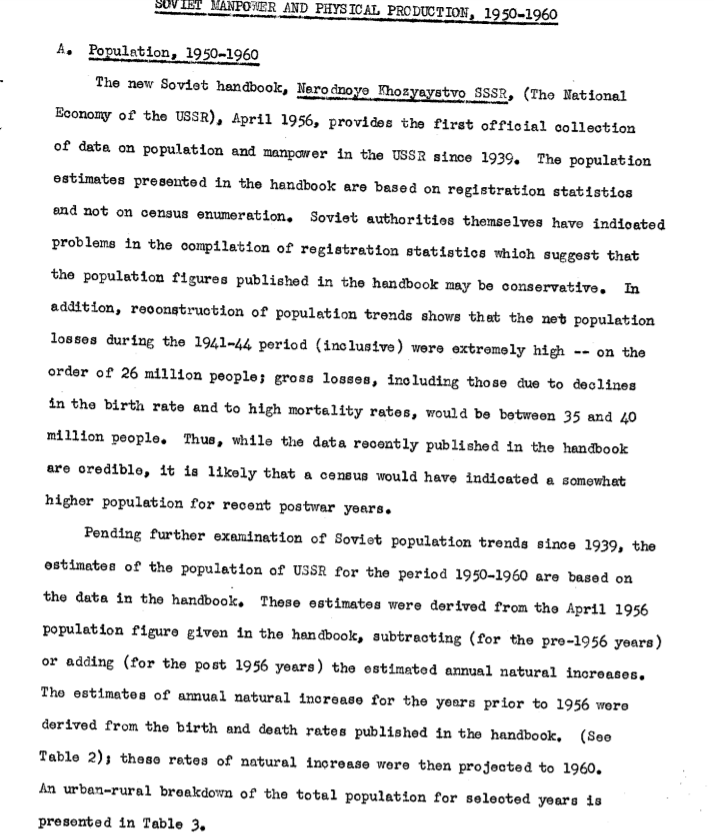 Но такие перерывы были не только не в СССР, так Всеукраинская перепись населения в 2001 году стала первой и пока единственной в истории независимой Украины, то есть уже 18 лет в Украине было переписей. Новая перепись должна пройти в Украине в следующем году. А ЦРУ писало (в документе "советская рабочая силы и физическая продукция") о первой послевоенной численности населения: В новом советском справочнике «Народное хозяйство СССР» (Народное хозяйство СССР), апрель 1956 года, содержится первый официальный