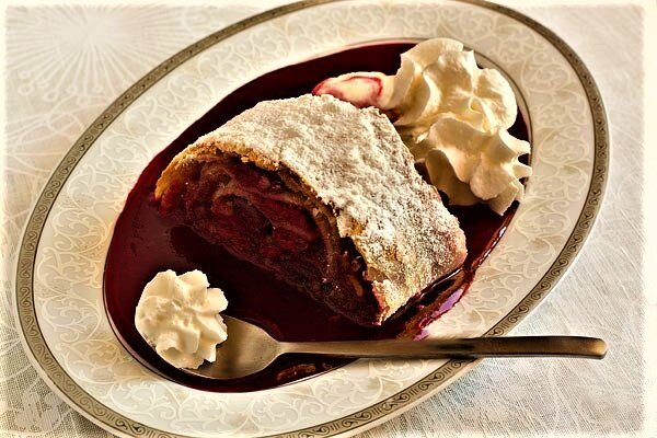 - Только обещай не злиться. Сладкий венский штрудель – одно из самых известных кондитерских изделий родом из Австрии. При всей его простоте этот сказочный пирог трудоемок и требует недюжей физической силы. Вашему вниманию осмелюсь предложить упрощенную версию этого замечательного печеного изделия. Вишнево-творожный ложный штрудель. Почему ложный? Ответ – очевиден. Мы не станем морочиться с вытяжным тестом, как этого требует традиция, а используем индустриальное слоеное бездрожжевое. Еще одна замена в составе штруделя. Соус сабайон, который при деликатном замораживании превращается мороженое, мы и поменяем на замечательный сливочный десерт фабричного производства. Вам понадобится: 1 упаковка теста 500г Мука на подпыл Для начинки: Печение бисквитное 150г (рекомендую палочки Савоярди, продается в Ашане) Ванилин 5г Сахарный песок 0-50г Вишня 600г Масло растительное рафинированное Сахарный песок Сыр творожный 150г (рекомендую Cremette в кондитерском мешке, продается в Ашане) Яичный жел