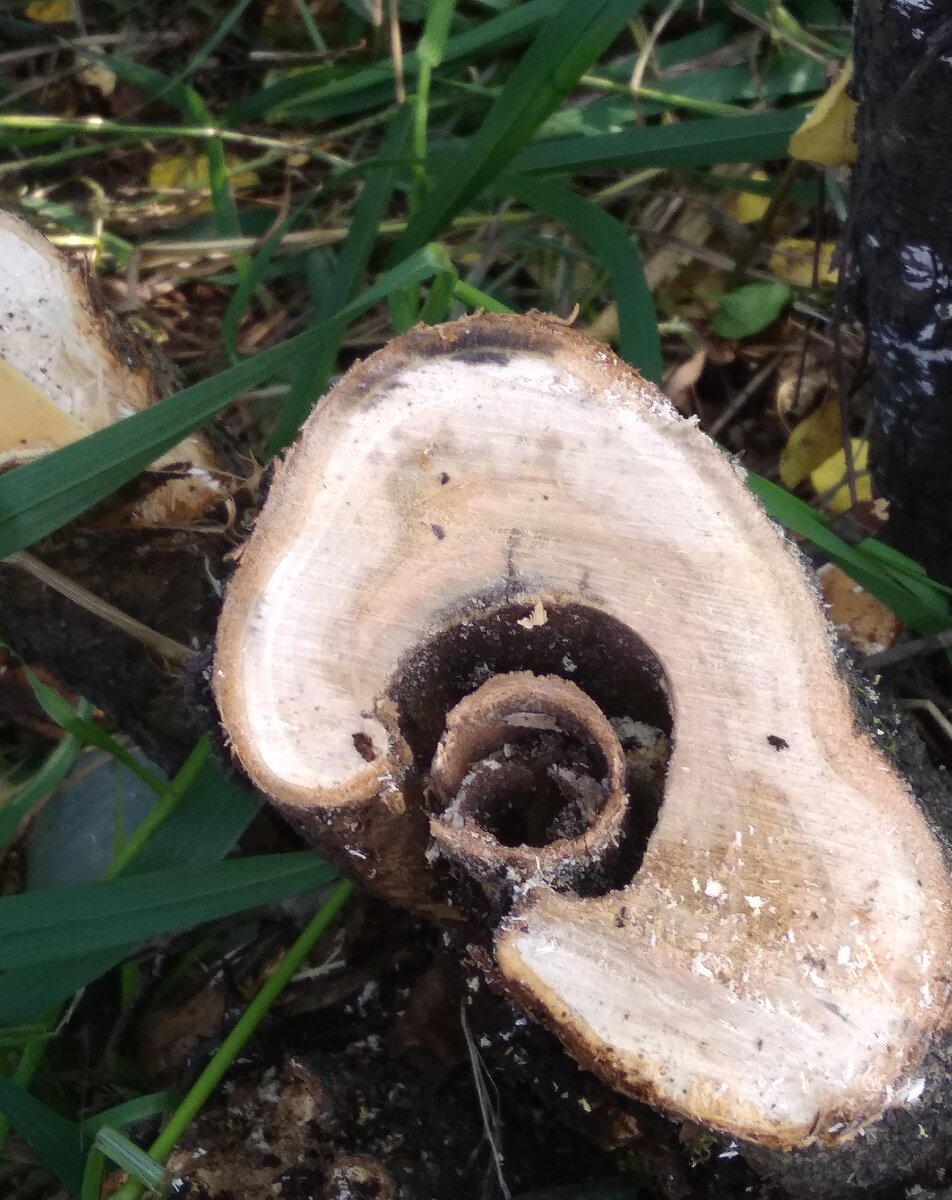 Начал я тут заниматься на участке своим любимым осенним занятием – выпиливанием старых и больных деревьев. Занимаюсь я этим ежегодно, каждую осень. Посмотрев на срез очередного спиленного дерева, был сильно удивлен. На срезе я увидел не одно дерево, а два. А спилил то я одно деревце. Более старое дерево обнимало молодое дерево. Получается, что взрослое дерево, в свое время, как бы съело более молодое дерево. Этакий каннибализм среди деревьев. Как такое получилось? Я вижу два варианта. Либо, более молодое дерево проросло через старое. Либо, более старое дерево, каким-то образом, обросло вокруг молодого деревца. Может быть, два деревца росли слишком близко друг к другу. И, в какой то момент, одно из них начало расти более интенсивно, чем сосед. А так как росли они слишком близко, более интенсивно растущее дерево начало обнимать более слабое дерево. В дальнейшем эти два деревца росли одно в другом, не мешая друг другу.