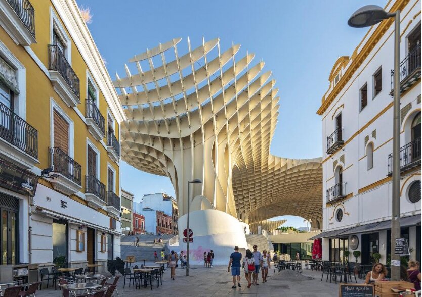 Если вас интересуют достопримечательности Севильи, то одним из них является Метропольский зонт (или гриб)! И действительно, футуристическое строительство, созданное в 2011 году, выглядит именно так. Всех удивляет не только его внешний вид, но и то, что оно было сделано полностью из дерева. Проект был разработан немецким архитектором Юргеном Майером, вдохновленного отделкой Севильского собора. Что, безусловно, не ускользнет от вашего внимания, что это одно из любимых мест для свободного времяпрепровождения жителей, туристов, молодежи и целых семей с детьми.