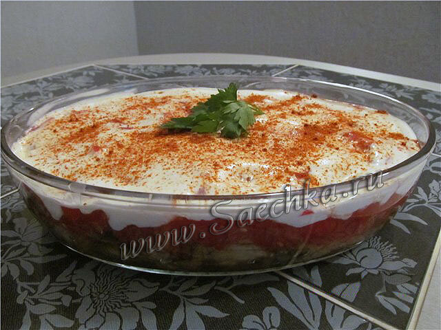 Очень вкусный салат из жареных баклажанов с помидорами и чесноком.