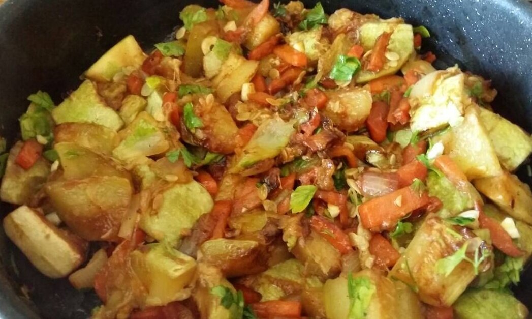 Никогда не любил кабачки и прочие безвкусные в свежем виде овощи, пока однажды не приготовил их так, как будет описано в настоящей статье, при этом пришлось испытать несколько вариантов, пока я не остановился на одном единственном. Данный гарнир идеально подходит под домашние котлетки и прочих их гастрономических родственников. Единственным недостатком этого рецепта является то, что все составляющие обязательно должны присутствовать, иначе получиться съедобно, но уже не то. Нам понадобиться: 1. Средний кабачок или половина здорового или два маленьких. 2. Морковка 1 штука. 3. Парочка сладких перцев, можно из морозилки. 4. Обязательно большущий помидор или пара средних. 5. Репка лука и головка чеснока. 6. Обязательно зелень укропа и петрушки. Один магазинный пучек, где обычно упакованы эти два вида зелени. 7. Растительное масло. 8. Соль и перец. 9. Кетчуп. Чистим кабачок от шкурки, даже маленький и свежий, с нежной кожицей, все равно чистим. Режем на кубики не больше 1,5 см. Меньше мо