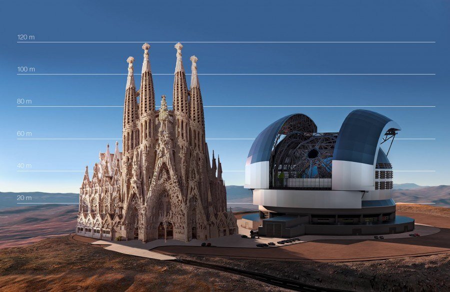 В далекой чилийской пустыне Атакама идет строительство фундамента Чрезвычайно большого телескопа ESO (ELT). Когда этот телескоп будет построен, он станет самым большим наземным телескопом мира. Весить он будет 3400 тонн. ELT будет полноповоротным рефлектором с сегментированным главным зеркалом диаметром 39,3 метра, вторичным зеркалом диаметром 4,2 метра и третьим зеркалом диаметром 3,7 метра. Конструкция телескопа предусматривает использование принципиально новой адаптивно-оптической техники, которая будет настолько хорошо корректировать искажения изображений небесных тел, вносимые земной атмосферой, что получаемые снимки будут более четкими, чем те, которые регистрируются из космоса. Башня телескопа будет иметь классическую куполообразную форму и будет защищать телескоп от ветра и осадков. Купол будет возвышаться над землей почти на 74 метра, а его диаметр будет сост