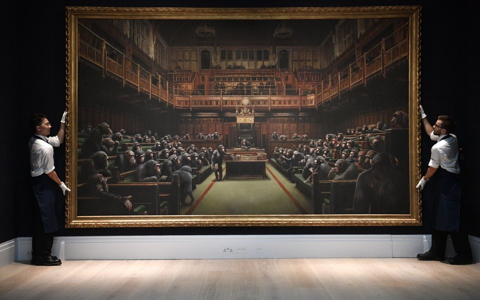 На торгах в Лондоне карикатура «Devolved Parliament» была продана с молотка за £9,9 миллионов. Полотно 2009 года, изображающее шимпанзе в в Палате общин, является самым большим живописным произведением художника – 2,5 на 4,2 метра. Торги продлились всего 13 минут, а цена на произведение современного искусства повысилась почти в 5 раз. И покупатель и продавец пожелали сохранить анонимность. Известно, что продавец был первым владельцем картины и приобрел её в 2011 году у самого Бэнкси, без посредничества выставок или аукционов. Интересы покупателя представляла главу отдела продаж аукционного дома Sotheby’s Эмму Бейкер. Предыдущий рекорд был поставлен в 2008 году на торгах Sothebyʼs в Нью-Йорке. Картина “Незапятнанность”, на которой девушка-уборщица заметает мусор под картину Дэмиена Херста “Пятна”, была продана за £1,04 миллиона. Авторскую копию работы Хёрста можно увидеть в гостиничном номере в Palms Casino Resort в Лас-Вегасе, который скрывает ещё немало секретов. Читайте на сайте