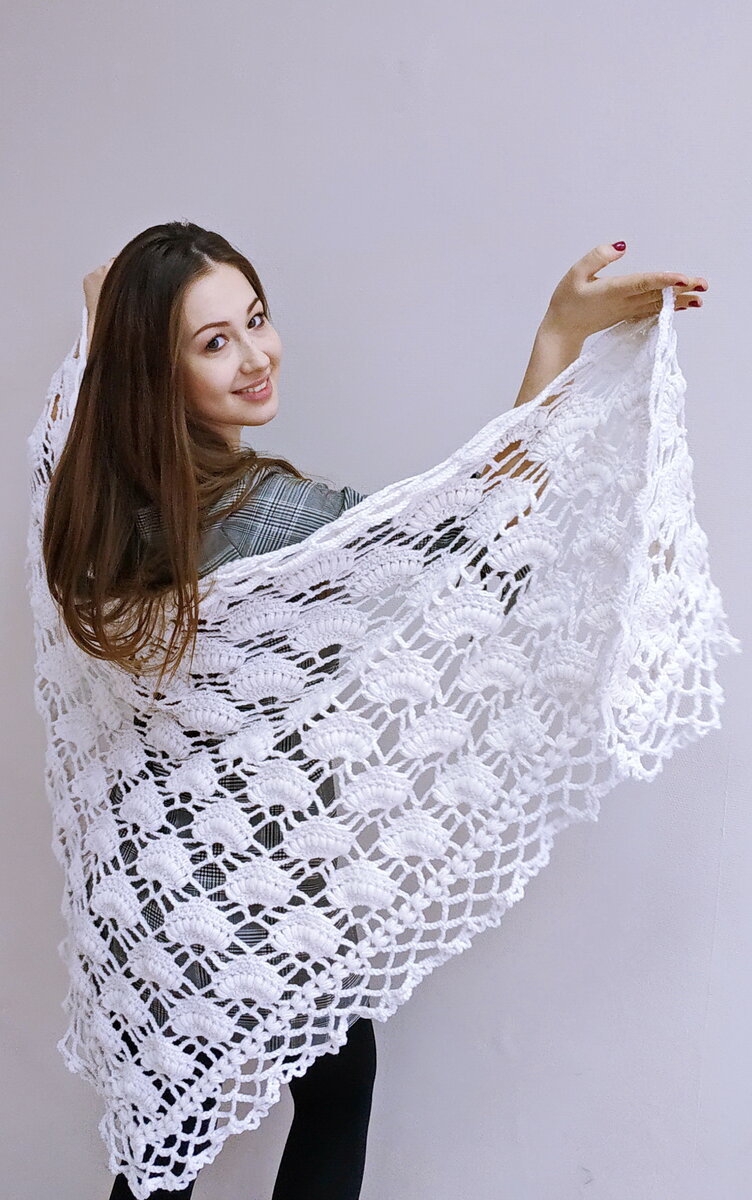 Ажурная шаль связана крючком Размеры шали – 200 х 100 Крючок № 4. Для этой шали потребуется 500 г пряжи полушерстяной ALIZE LANAGOLD белого цвета. Видеоурок по вязанию шали: Рабочие петли: воздушная петля, столбик с накидом, столбик без накида, пышный столбик. Вязание шали начинаем с нижнего угла: 7 воздушных петель соединить в кольцо и продолжить согласно схеме 1. Для оформления готовой шали по краям связать 3 ряда арок из 8 в. п. и заключительный ряд – арка из 4 в.п. см. схему 2. Можно, по желанию, край украсить бахромой. Для бахромы нарезать нитей длиной 25 см. Согнув пополам, сформировать бахрому.