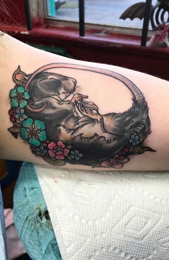 Невероятная плодовитость и выносливость крыс стали качествами, которые ассоциируются с большой и дружной семьей, в которой полно здоровых детей. Для девушек татуировка крыса — способ привлечь к себе счастье материнства, обзавестись надежным и любящим партнером. Нередко встречаются тату с крысой, которая изображена с красивой белой шерсткой, выразительными глазами и милой мордашкой с трогательными усиками. Этот симпатичный образ дополняют нежными цветами, растительными узорами, подчеркивая романтичность и мягкость своего характера.