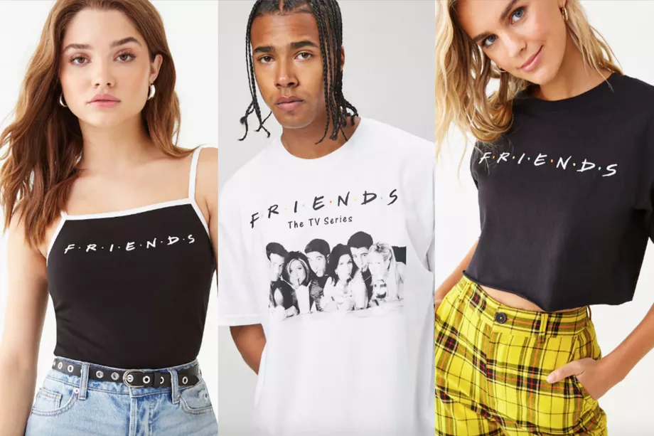 Дружеский ренессанс сделал так, что в стандартный торговый магазин сложно заходить и избегать футболок с логотипом 25-летнего телешоу. Old Navy, Hot Topic, Forever 21, Pac Sun и Target все они в настоящее время продают лицензированную и товарную одежду друзей, разработанную для их целевой аудитории: Вы можете найти футболку в Old Navy, в Forever 21, и рубашку, которая говорит "Как поживаешь "? "в Hot Topic.
